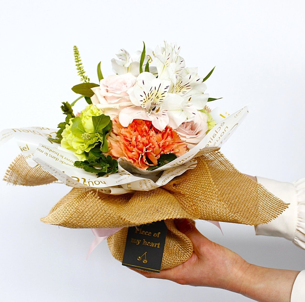ナチュラルで可愛らしいオレンジ&ピンク系統のお花で束ねたブーケです。自然素材の麻布やゴールドの英字プリントのペーパーでお洒落にラッピングしました。