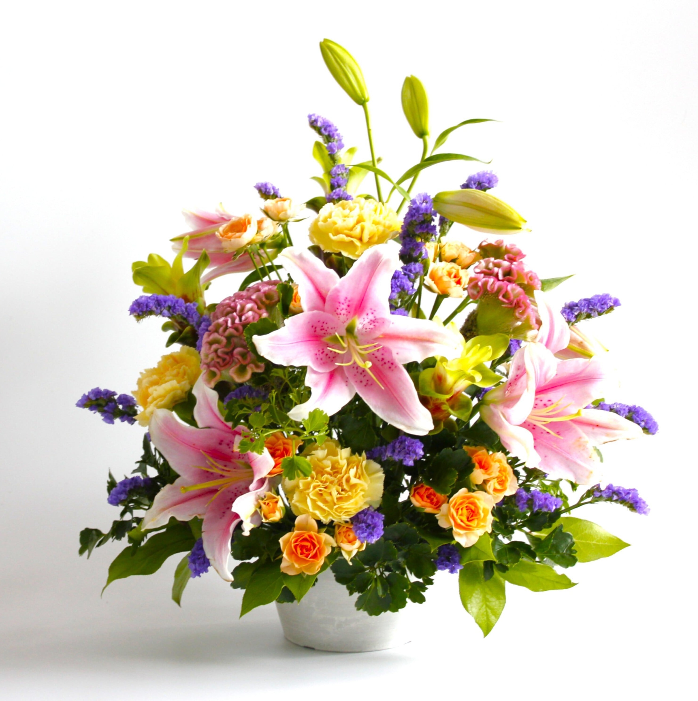 百合を入れた華やかで豪華なおまかせのアレンジメントです。百合の色や種類は変わる場合がございます。(商品はイメージです。花や器は季節や仕入れ状況により種類、色等変更になります。)